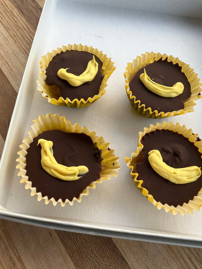 Prepare 2 mini muffin pans with mini cupcake liners. Place the cookies in a food processor with 2 T. of coconut cream and puree until the cookies become a sandy texture. Place 1 tsp. of the cookie mixture in the bottom of the prepared muffin pan and press to spread it evenly across the bottom of the cupcake liners. Next, place the bananas, 1 T. cornstarch, 1 tsp. vanilla, 1 T. confectioners sugar, and 4 T. coconut milk into the food processor and blend until creamy. In a small saucepan, heat the banana cream over medium heat while continuously stirring for just a couple of minutes to thicken. Spoon thickened banana cream, 1 tsp. each on top of cookie layer in the muffin pans. In a double boiler (medium saucepan with a few inches of water in the bottom with a heat proof bowl on top) over medium-high heat, melt the chocolate chips. Lastly, cover the tops of each banana cream with a thin layer of melted chocolate, then place them in the refrigerator to set. If you would like to add a yellow frosting banana, you can once they are ready, using store bought yellow writing frosting.