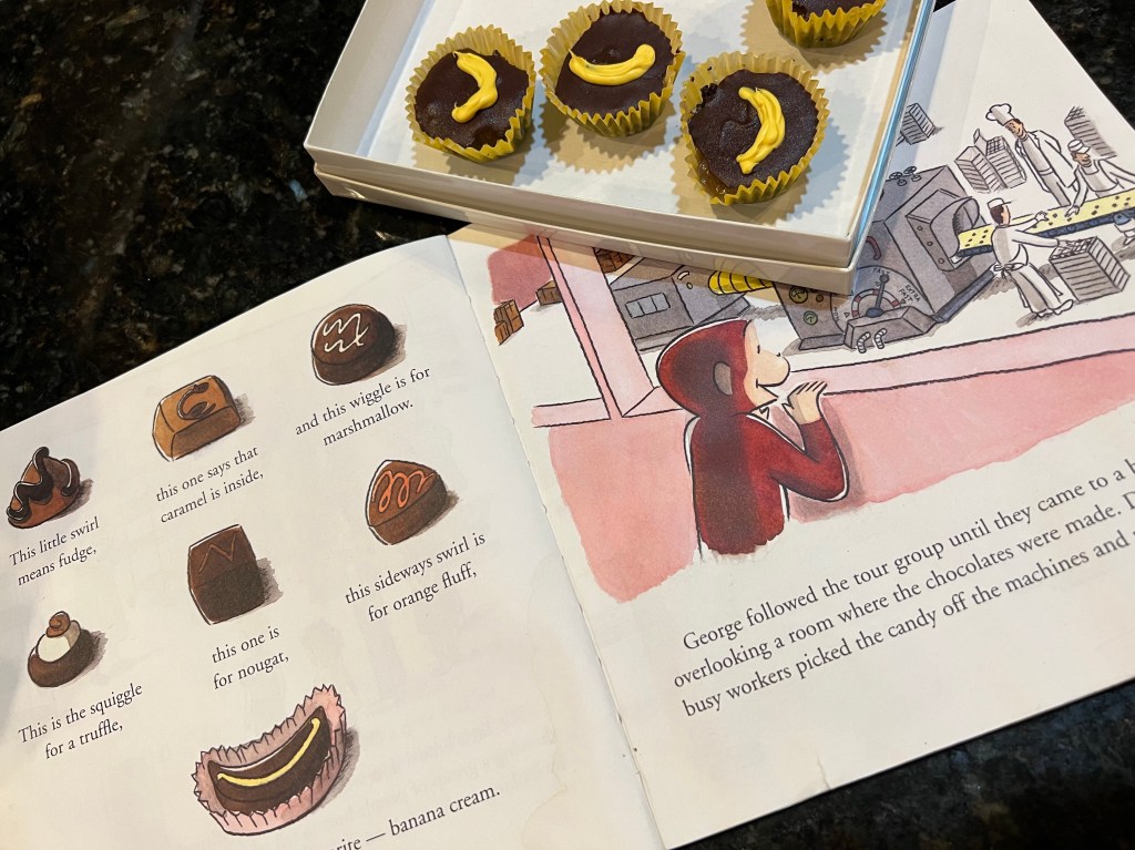 In the book Curious George Goes to a Chocolate Factory, by Margret & H.A. Rey, George’s curiosity leads him into the packaging room of a chocolate factory. With one careless step, George causes trouble for the workers but as always he ends up saving the day. This story really leaves you wanting to try a banana cream filled chocolate just like George! This recipe makes plenty to share or fill your own boxes to keep in the refrigerator for at least a week.