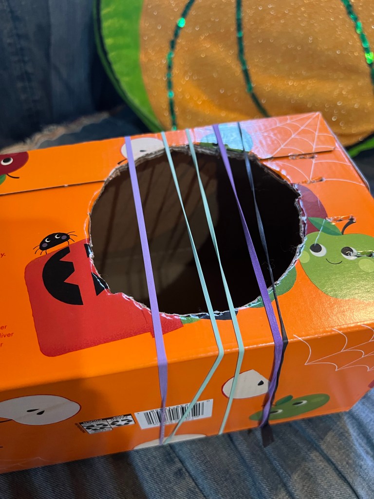 Take an empty box and tape the ends securely shut. Have an adult (because it can be tricky!) help to cut out a circle on the front or back of the box. How big you make the circle depends on the size of the box you are using, but it should be centered in the middle and not too close to the sides. Next take 3 or 4 stretchy rubber bands and put them around the box going across the hole. Gently pluck away at the bands to make your music!