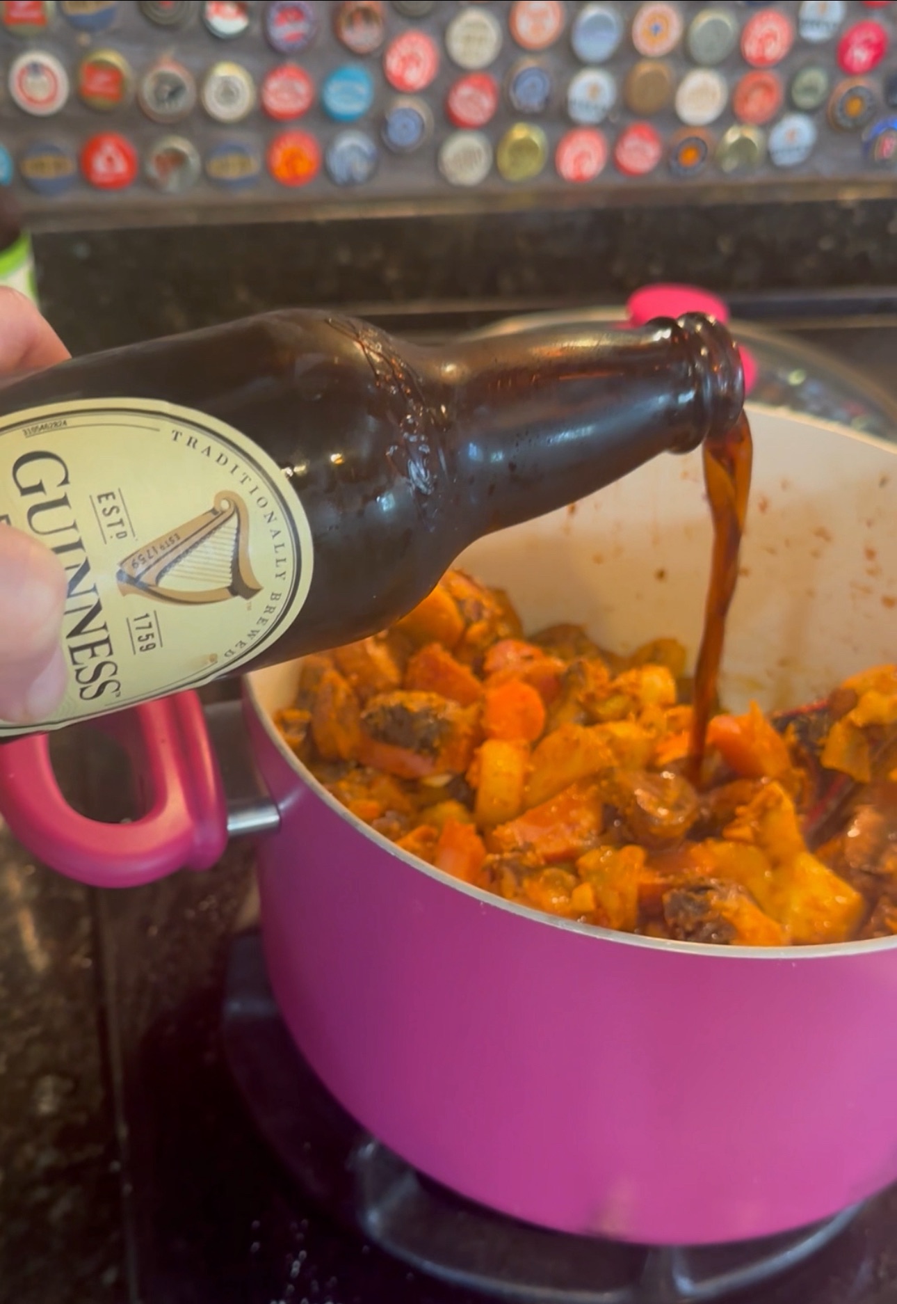 Roughly dice all of the vegetables. Drizzle olive oil into a large pot, over medium high heat and add onions, carrots and potatoes. Season with salt, pepper, cayenne and thyme. Continue cooking until the onions become soft. Add the tomato paste and butter to the pot and stir well to coat the vegetables. In a large bowl, lightly toss the chopped mushrooms with the 4T. of flour. Add the mushrooms to the pot and stir together until the flour is entirely incorporated with the buttery tomato paste. Continue to cook for a few minutes while stirring. Next add in the Guinness and vegetable stock. Once the stew comes to a boil, turn the heat to low, cover and let simmer for about 20 minutes or until all the vegetables are tender and cooked through. Garnish with fresh chopped parsley.